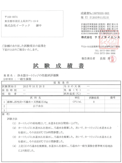 水道水をろ過した後、35℃の環境下で13日もの間、雑菌がゼロだった試験結果が出ています。